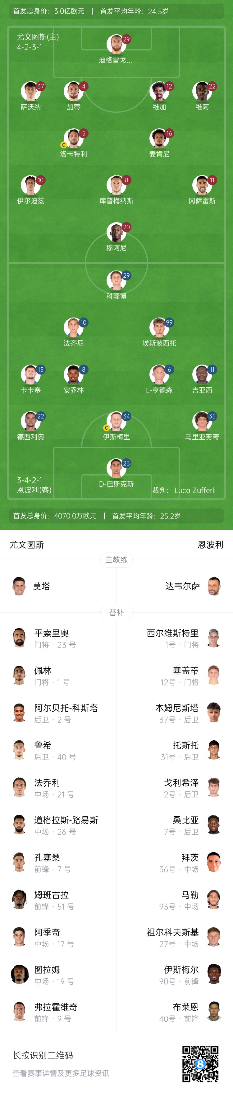 尤文首發(fā):29-迪格雷戈里奧、4-加蒂、37-薩沃納、12-維加、5-洛卡特利、8-庫普梅納斯、11-尼古拉斯-岡薩雷斯、16-麥肯尼、22-維阿、10-伊爾迪茲、20-穆阿尼