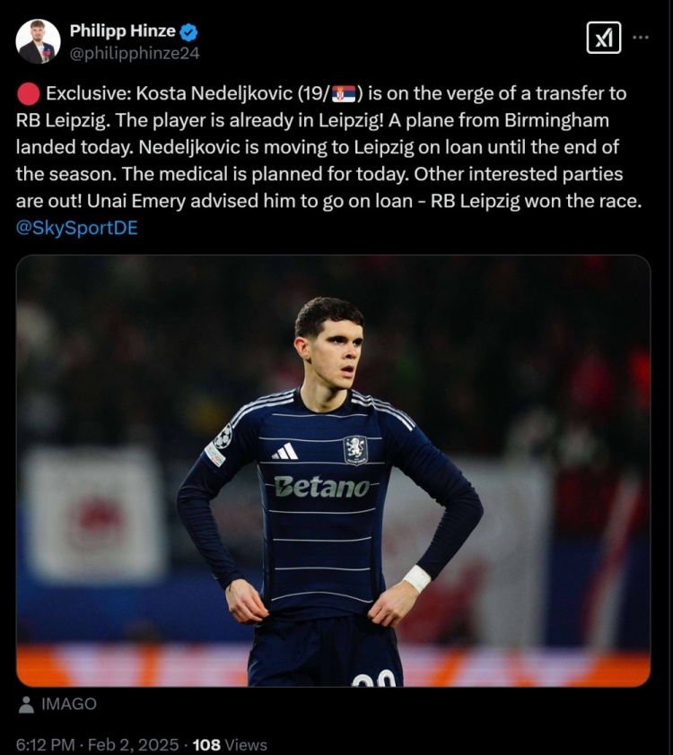 目前,球員已經(jīng)乘坐飛機從伯明翰抵達了萊比錫。內德伊科維奇將以租借形式加盟萊比錫,直到本賽季結束。球員的體檢計劃在今天進行。維拉主帥埃梅里建議這名小將外租鍛煉,現(xiàn)在?萊比錫贏下了球員爭奪戰(zhàn)。