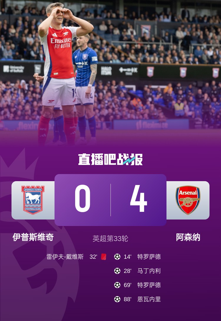 阿森納4-0橫掃伊普斯維奇,槍手方面特羅薩德雙響,馬丁內(nèi)利、恩瓦內(nèi)里破門。