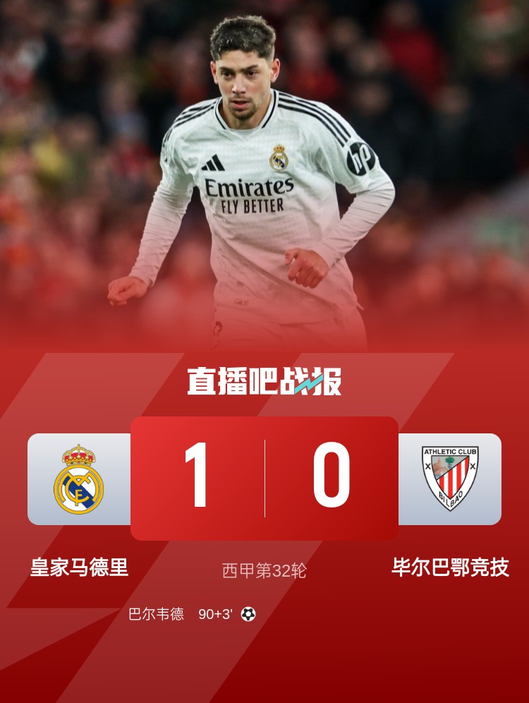 落后榜首4分!皇馬1-0畢爾巴鄂 巴爾韋德補(bǔ)時(shí)世界波絕殺制勝