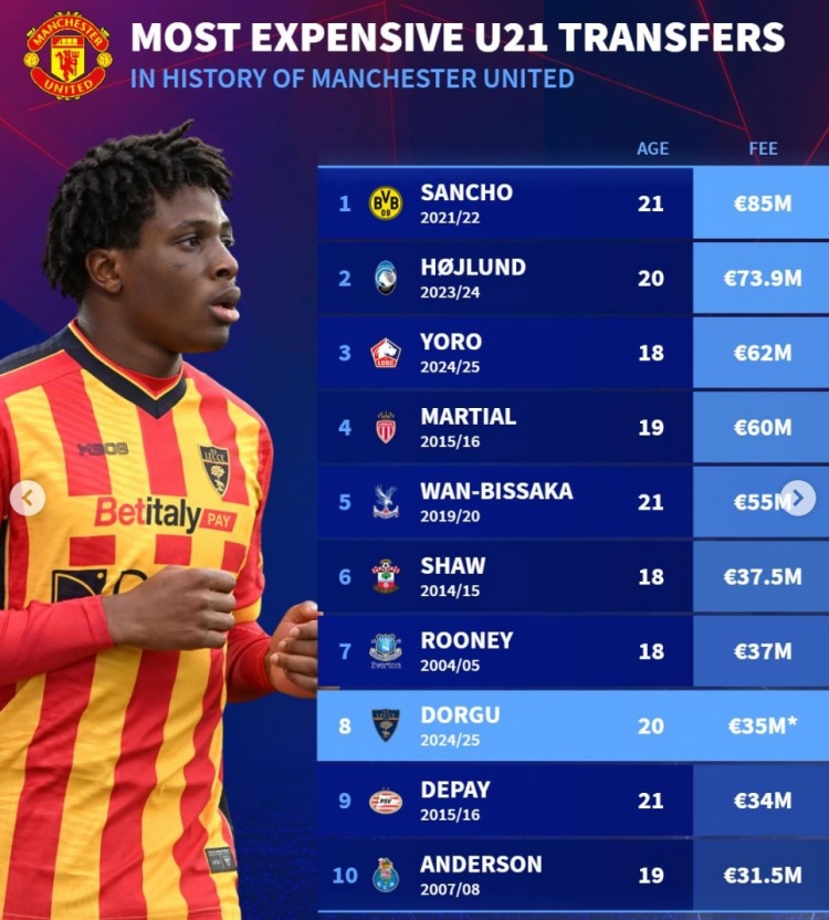 2月2日訊 曼聯(lián)已經(jīng)官宣從萊切引進(jìn)翼衛(wèi)多古,《轉(zhuǎn)會市場》也統(tǒng)計了曼聯(lián)隊史U21球員引援榜。