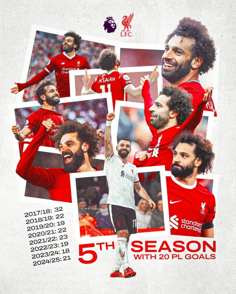 薩拉赫本賽季出戰(zhàn)23場英超比賽,打進(jìn)21球,助攻13次,第5次英超單賽季進(jìn)球20+。利物浦官方社媒曬出為薩拉赫制作的海報,配文:“薩拉赫成為歷史上第5位至少5個賽季英超進(jìn)球20+的球員?!?/p>