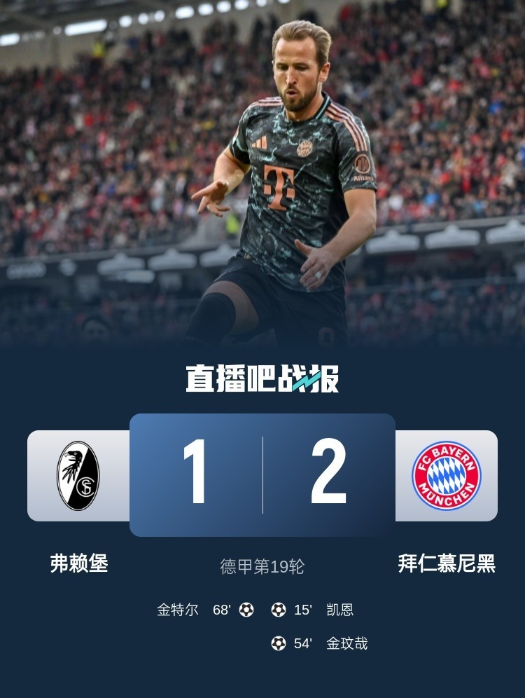 德甲第19輪,拜仁客場2-1弗賴堡,凱恩、金玟哉進(jìn)球。