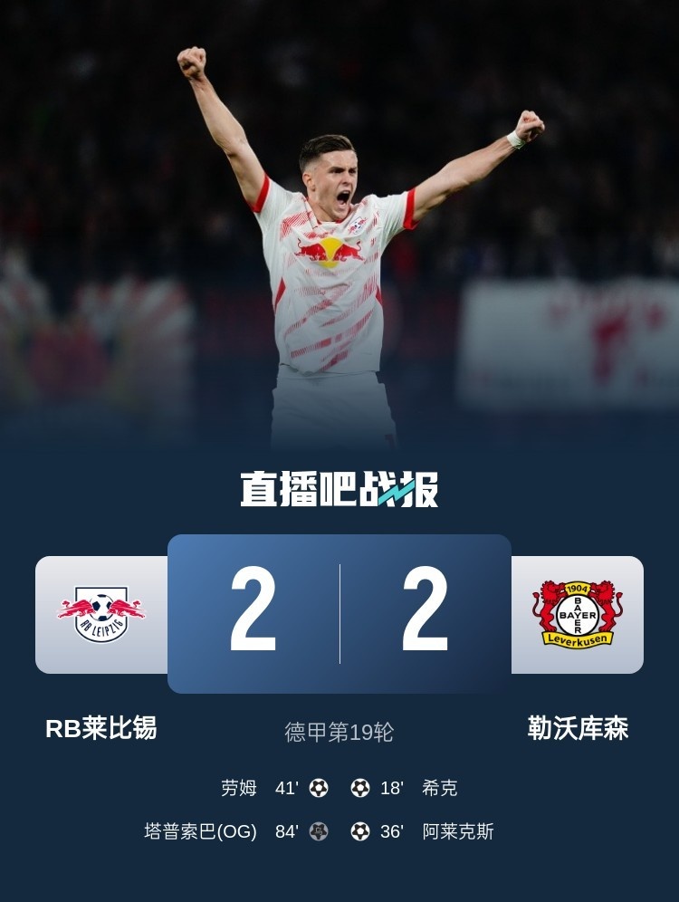 德甲第19輪,勒沃庫森2-2RB萊比錫,???、阿萊克斯進(jìn)球。