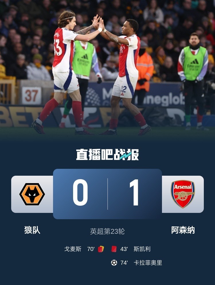 英超聯(lián)賽第23輪,十人阿森納1-0十人狼隊(duì),斯凱利染紅惹爭議,卡拉菲奧里制勝。