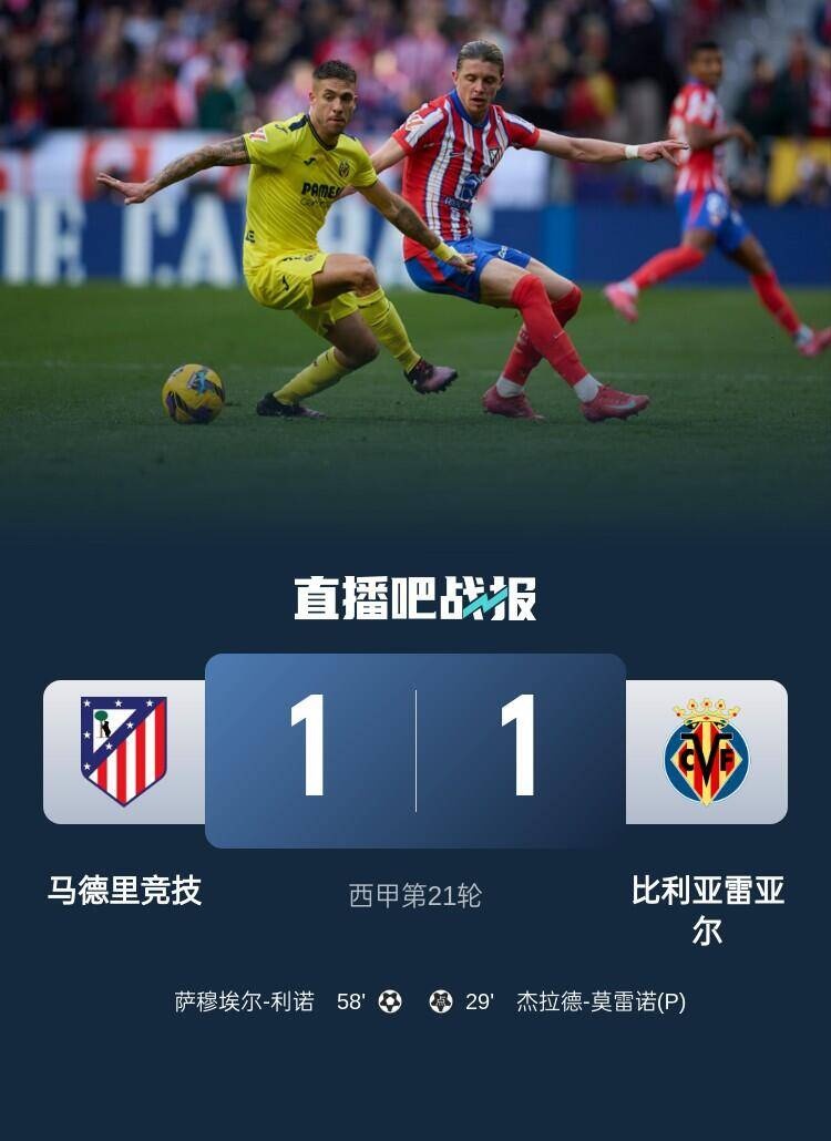 西甲第21輪,馬德里競技1-1戰(zhàn)平比利亞雷亞爾,利諾進(jìn)球。