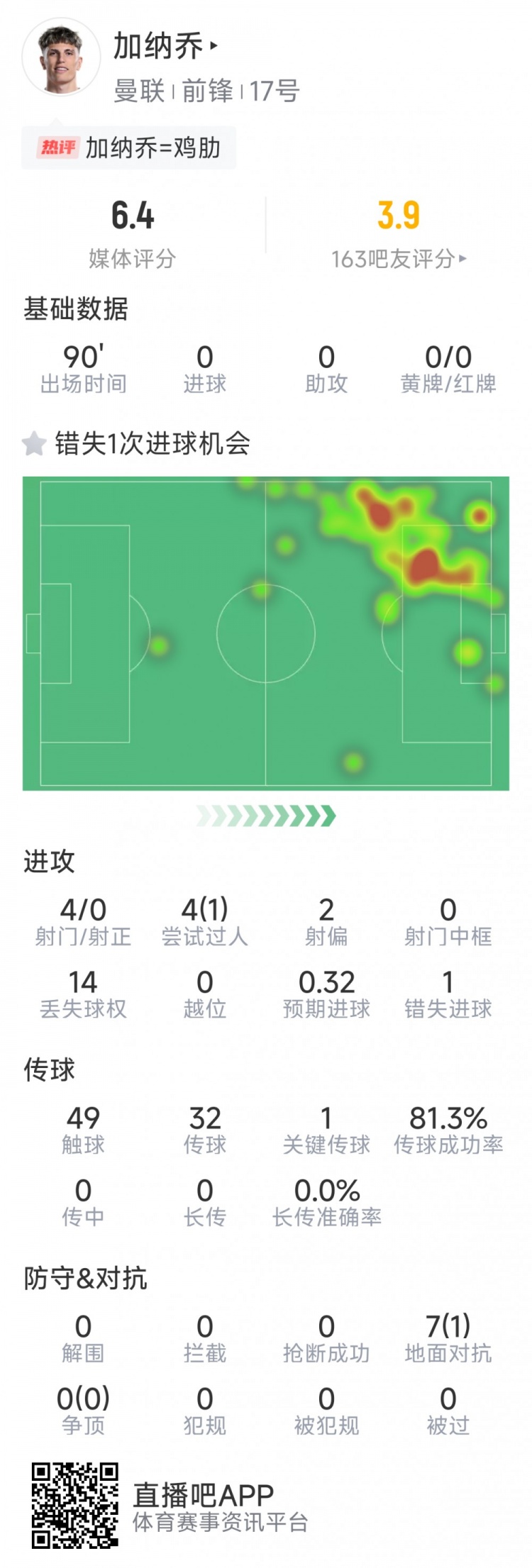 2月3日訊 在本輪英超,曼聯(lián)0-2不敵水晶宮。本場比賽加納喬發(fā)揮不佳,以下為他在本場數(shù)據(jù):比賽時(shí)間90分鐘3次射門0射正4次過人1次成功1次錯(cuò)失良機(jī)49次觸球1次關(guān)鍵傳球傳球成功率78.8%7次對抗1次成功sofa評分6.4分 本文標(biāo)簽: 足球 英超 曼聯(lián)