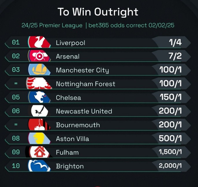 2月3日訊 在本輪英超,阿森納5-1大勝曼城。在最新的本賽季英超奪冠賠率中,利物浦仍居首,利物浦、阿森納已經(jīng)遙遙領(lǐng)先并列第三的曼城,具體如下:1、利物浦 1/42、阿森納 7/23、曼城 100/1=諾丁漢森林5、切爾西 150/16、紐卡 200/1=伯恩茅斯8、維拉 500/19、富勒姆 1500/1=布萊頓 本文標(biāo)簽: 足球 英超 利物浦 阿森納 曼城