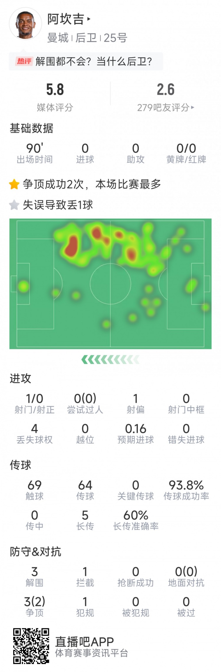 2月3日訊 在本輪英超,曼城1-5不敵阿森納。本場(chǎng)比賽阿坎吉開(kāi)場(chǎng)失誤送禮,以下為他在本場(chǎng)數(shù)據(jù):比賽時(shí)間90分鐘1次射門(mén)69次觸球傳球成功率93.8%3次解圍1次攔截3次對(duì)抗2次成功sofa評(píng)分5.8分 本文標(biāo)簽: 足球 英超 曼城