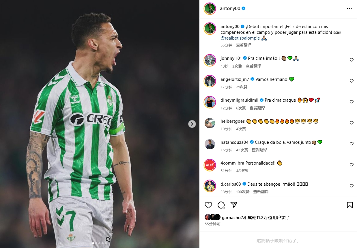 2月3日訊 西甲第22輪比賽,安東尼首發(fā)出戰(zhàn)上演貝蒂斯首秀,幫助貝蒂斯主場2-2戰(zhàn)平畢爾巴鄂,他也當選此役全場最佳球員。安東尼賽后在社交媒體上寫道:“重要的首秀!很高興與我的隊友們在場上并肩作戰(zhàn),為貝蒂斯球迷們踢球!”安東尼射門被撲,隊友補射破門 本文標簽: 足球 西甲 貝蒂斯 英超 曼聯(lián)
