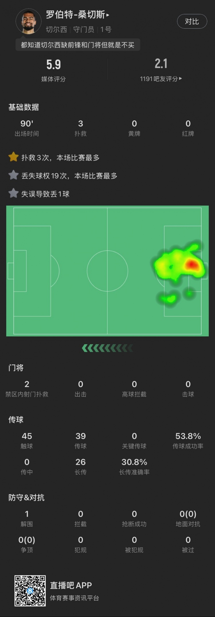 1月26日訊 本輪英超焦點大戰(zhàn),切爾西1-3遭曼城逆轉(zhuǎn)。本場比賽,桑切斯發(fā)揮不佳,1次失誤直接導致丟球,評分5.9僅次于科爾維爾和胡桑諾夫。桑切斯本場數(shù)據(jù)↓撲救:3禁區(qū)內(nèi)射門撲救:2觸球:45丟失球權(quán):19傳球:39傳球成功率:53.8%長傳:26長傳準確率:30.8%解圍:1失誤導致丟球:1 本文標簽: 足球 英超 切爾西 曼城