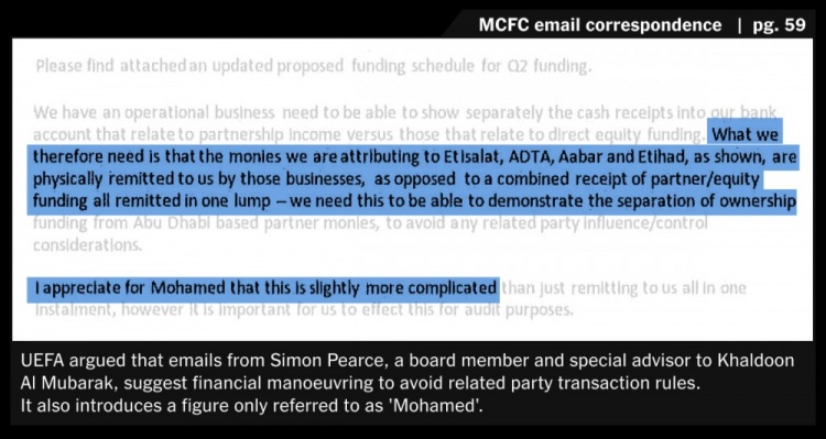 歐足聯(lián)表示,西蒙-皮爾斯的郵件中表明,為規(guī)避關(guān)聯(lián)交易規(guī)則,進(jìn)行了一些財(cái)務(wù)操作。西蒙-皮爾斯是曼城董事會成員,也是穆巴拉克的特別顧問。郵件中還引入了一個叫做“穆罕默德”的代稱。