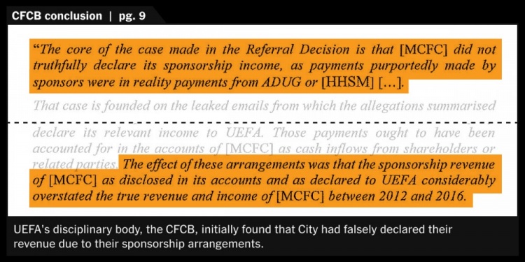 最初,CFCB聽證會發(fā)現(xiàn),曼城違反了其規(guī)定第56條,未能提供所要求的信息,并一度提出球隊(duì)所有權(quán)“存在作假”的指控。