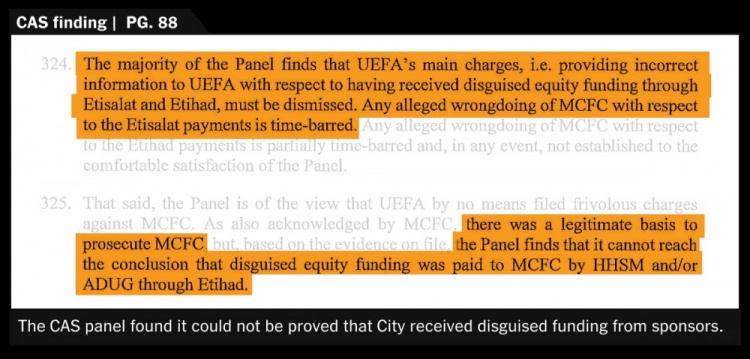CAS三人小組中的兩人駁回了曼城通過伊蒂哈德航空和阿聯(lián)酋電信收到變相付款(或者說是“假贊助”)的主要指控,認(rèn)為所有與阿聯(lián)酋航空付款有關(guān)的“證據(jù)”都已經(jīng)超過時效,伊蒂哈德航空的付款也是如此。并且無論如何,提供錯誤信息的指控尚未成立。
