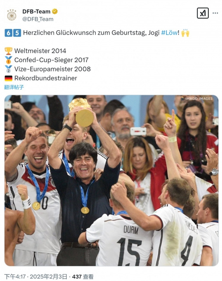 2月3日訊 今天是前德國隊主帥勒夫的65歲生日,德國隊官方為他送上祝福。德國隊官方社媒曬出勒夫舉起大力神杯的照片,配文:“65歲生日快樂,勒夫!2014年世界杯冠軍、2017年聯(lián)合會杯冠軍、2008年歐洲杯亞軍、國家隊教練紀(jì)錄(執(zhí)教場次)!”勒夫2006年到2021年期間執(zhí)教德國隊,帶隊?wèi)?zhàn)績125勝39平34負(fù)。 本文標(biāo)簽: 足球 德國 德甲