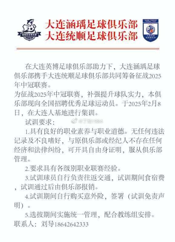 1月26日訊 據(jù)記者丁旭報(bào)道,中冠大連涵瑀足球俱樂(lè)部、大連統(tǒng)順足球俱樂(lè)部共同發(fā)布招聘球員公告。