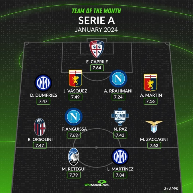2月3日訊 whoscored統(tǒng)計了意甲1月評分最佳陣容,國米、那不勒斯、熱那亞均2人入圍。