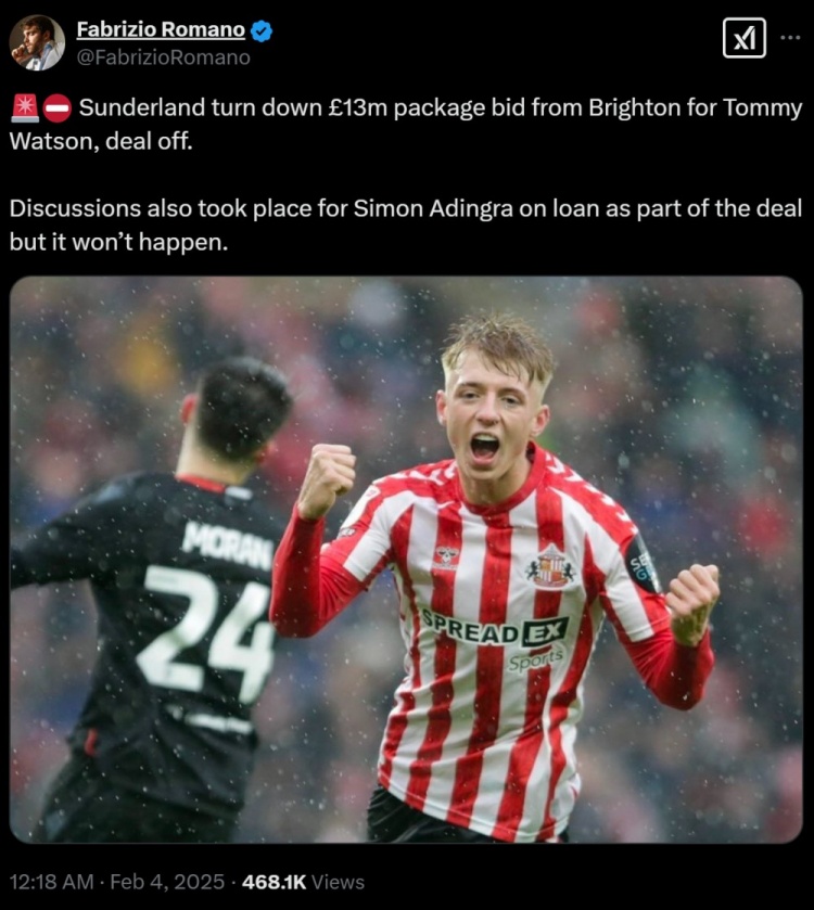2月4日訊 名記羅馬諾消息,布萊頓開(kāi)出總價(jià)1300萬(wàn)英鎊的報(bào)價(jià)(含獎(jiǎng)金),求購(gòu)18歲前鋒沃特森,遭到了桑德蘭的拒絕。