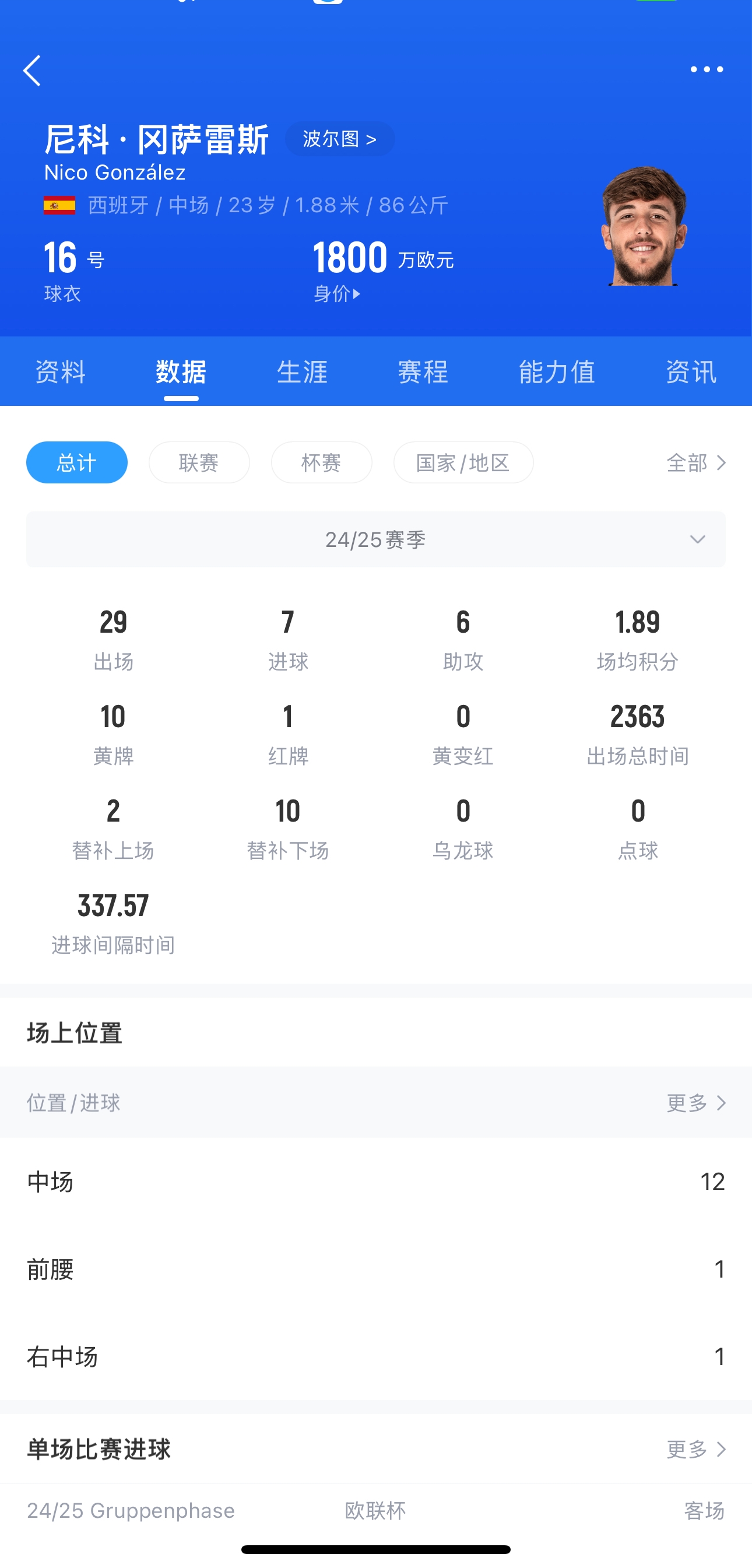 尼科-岡薩雷斯,現(xiàn)年23歲,西班牙中場,出自拉瑪西亞青訓(xùn),2023年夏窗波爾圖花費(fèi)840萬歐簽下球員,本賽季尼科代表波爾圖出戰(zhàn)29場比賽,貢獻(xiàn)7球6助,目前球員德轉(zhuǎn)身價(jià)1800萬歐。