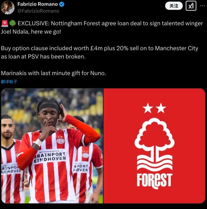 羅馬諾在社媒寫道:“獨(dú)家消息:諾丁漢森林同意以租借方式簽下天才邊路球員喬爾-恩達(dá)拉,HWG!由于曼城和埃因霍溫就球員租借的相關(guān)事項(xiàng)已經(jīng)破裂,諾丁漢森林從中介入,據(jù)悉租借合同中將附帶400萬鎊+20%未來轉(zhuǎn)會(huì)分成的買斷條款?!?/p>