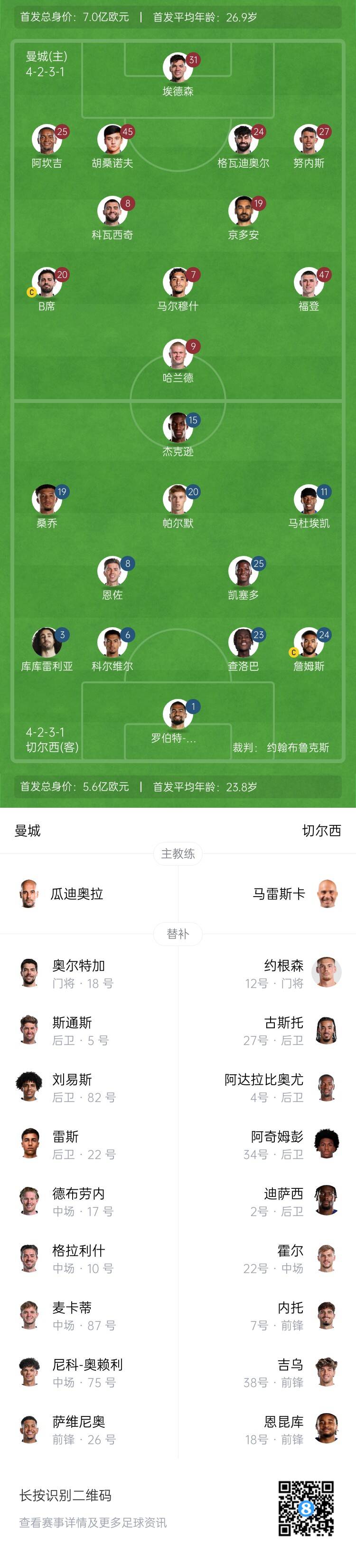 曼城首發(fā):31-埃德森、25-阿坎吉、45-胡桑諾夫、24-格瓦迪奧爾、19-京多安、27-努內(nèi)斯、8-科瓦西奇、20-B席、47-福登、7-馬爾穆什、9-哈蘭德