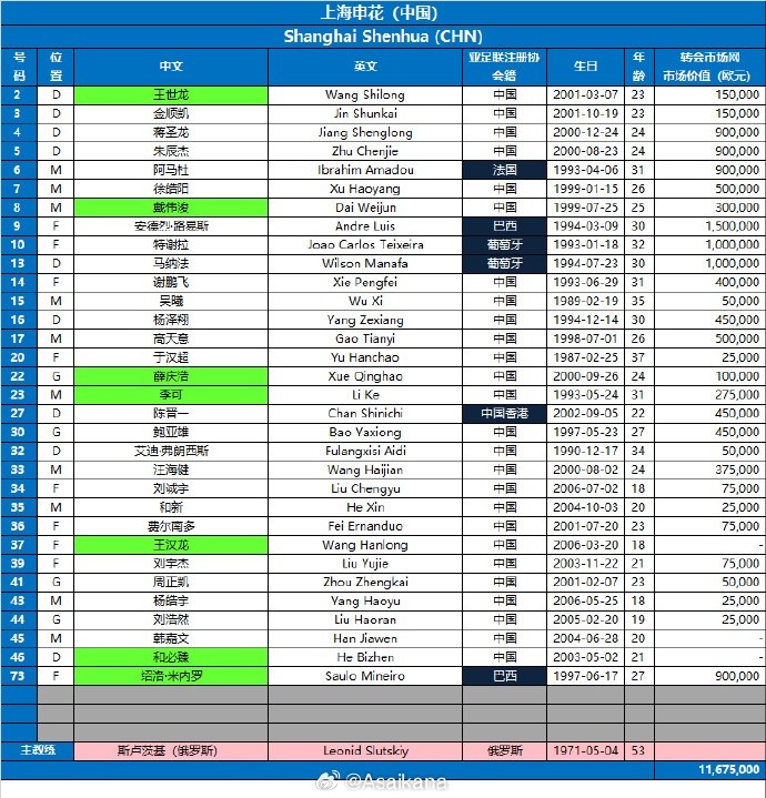 上海申花亞冠報名名單(綠色底紋代表對比第2報名窗口,此次報名窗口新增加的球員,圖源朱藝微博)