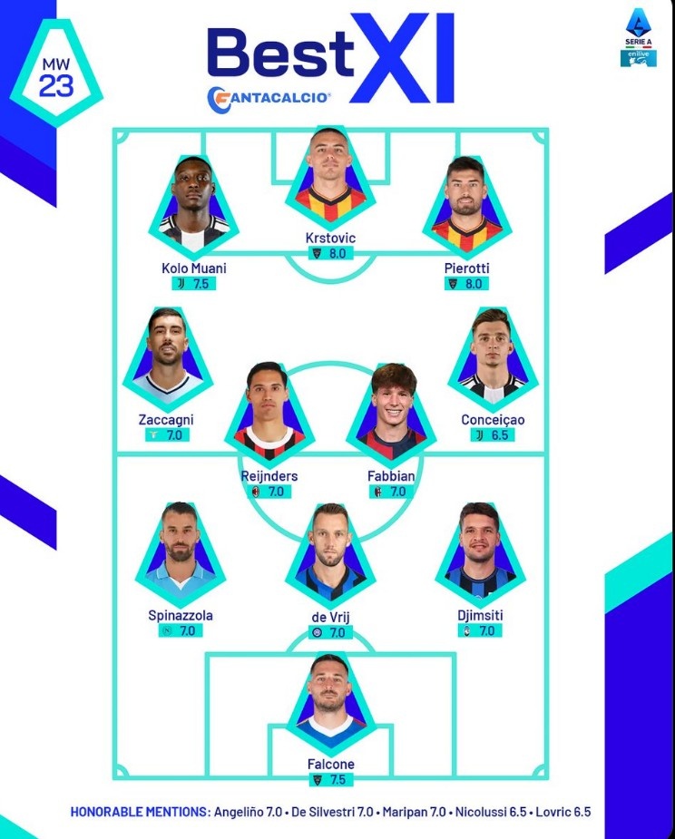 2月4日訊 意甲第23輪戰(zhàn)罷,意甲官方也評(píng)選出本輪最佳陣容,其中德弗里、賴因德斯、穆阿尼在列,以下為具體陣容:
