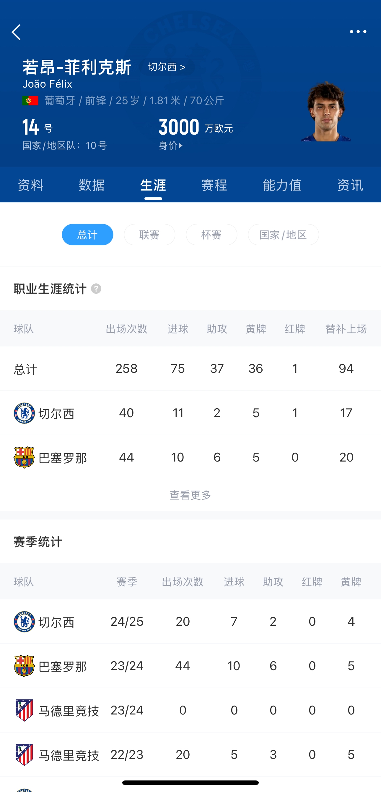 菲利克斯,現(xiàn)年25歲,葡萄牙前鋒,去年夏窗切爾西花費5200萬歐從馬競簽下球員,本賽季菲利克斯共代表切爾西出戰(zhàn)20場比賽,貢獻7球2助,目前球員德轉(zhuǎn)身價3000萬歐。