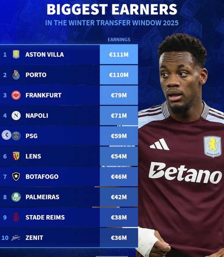 2月5日訊 五大聯(lián)賽已經(jīng)關(guān)窗,《轉(zhuǎn)會市場》也統(tǒng)計了今年冬窗各隊收入情況,維拉力壓波爾圖居首。