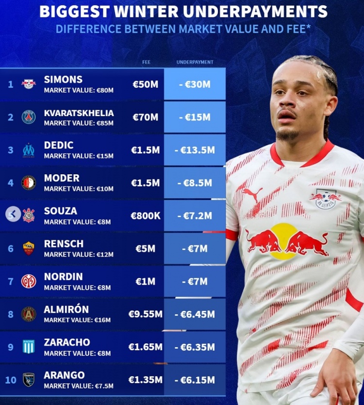 2月5日訊 五大聯(lián)賽冬窗已經(jīng)結(jié)束,《轉(zhuǎn)會(huì)市場》也列出了冬窗折價(jià)引援榜,哈維-西蒙斯居首。