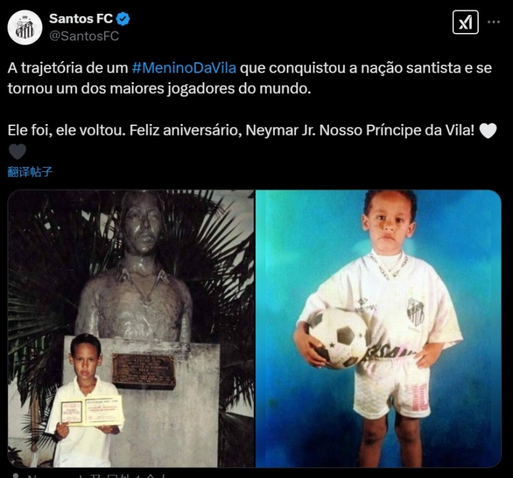 桑托斯曬出了內(nèi)馬爾兒時(shí)身穿桑托斯球衣的照片,并配文:“我們的鄉(xiāng)村男孩的過往軌跡,他征服了桑托斯并成為了世界最佳之一。他離開過,他又回來了。生日快樂,內(nèi)馬爾。我們的王子!”