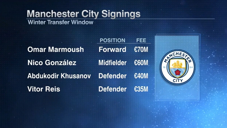 曼城冬窗花費2.1億歐元引進(jìn)了馬爾穆什、尼科-岡薩雷斯、胡桑諾夫以及雷斯4位新援,他們將在歐冠淘汰賽附加賽對陣皇馬,兩回合比賽分別2月11日以及2月19日進(jìn)行。