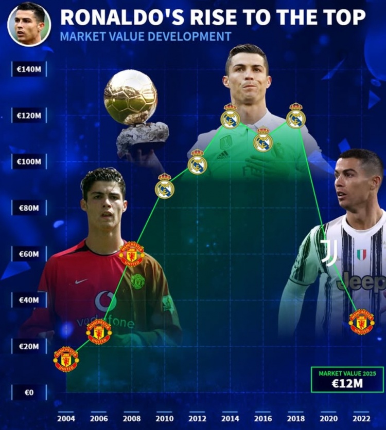 《轉(zhuǎn)會市場》在2004年才錄入C羅的身價(jià),2004年達(dá)到1800萬歐元,2008年贏得歐冠時(shí)上漲到6000萬歐元。