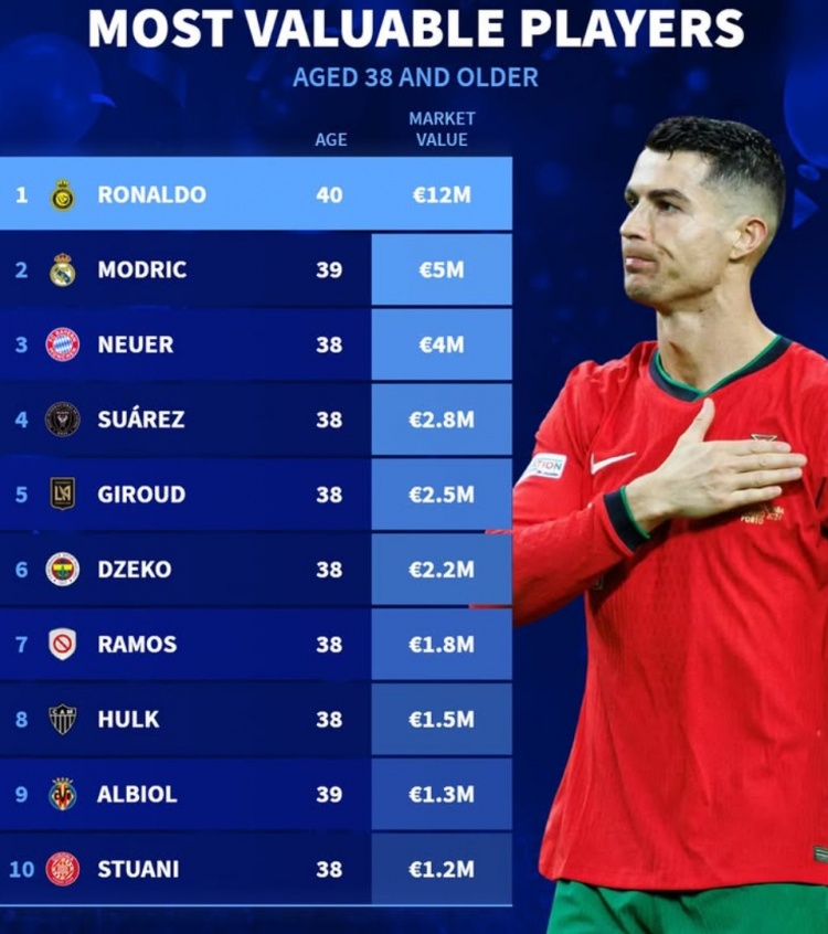 2月6日訊 《轉(zhuǎn)會市場》統(tǒng)計了38歲及以上球員身價榜,40歲的C羅居首。