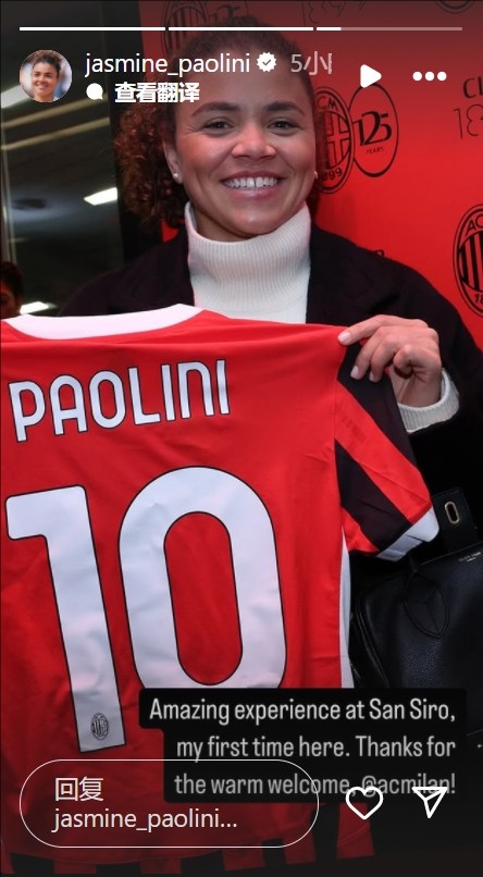 與此同時,保利尼還獲贈一件印有她名字的米蘭10號球衣,她在社媒寫道:“在圣西羅的非凡體驗,這是我第一次來這里,謝謝米蘭的熱烈歡迎?!?/p>