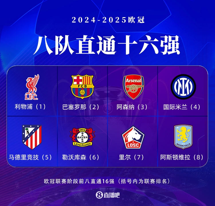 “聯(lián)賽階段”打完有8支隊(duì)伍拿到了直通淘汰賽的資格,分別是(按排名)利物浦、巴塞羅那、阿森納、國際米蘭、馬德里競技、勒沃庫森、里爾和阿斯頓維拉。前四位雖然都是豪門級別,馬競也算是歐冠老手了,不過勒沃庫森、里爾、維拉的突圍還是很多人沒想到的。特別是在跟很多強(qiáng)手過招后,他們還能出現(xiàn)在這個位次,真的不是浪得虛名。