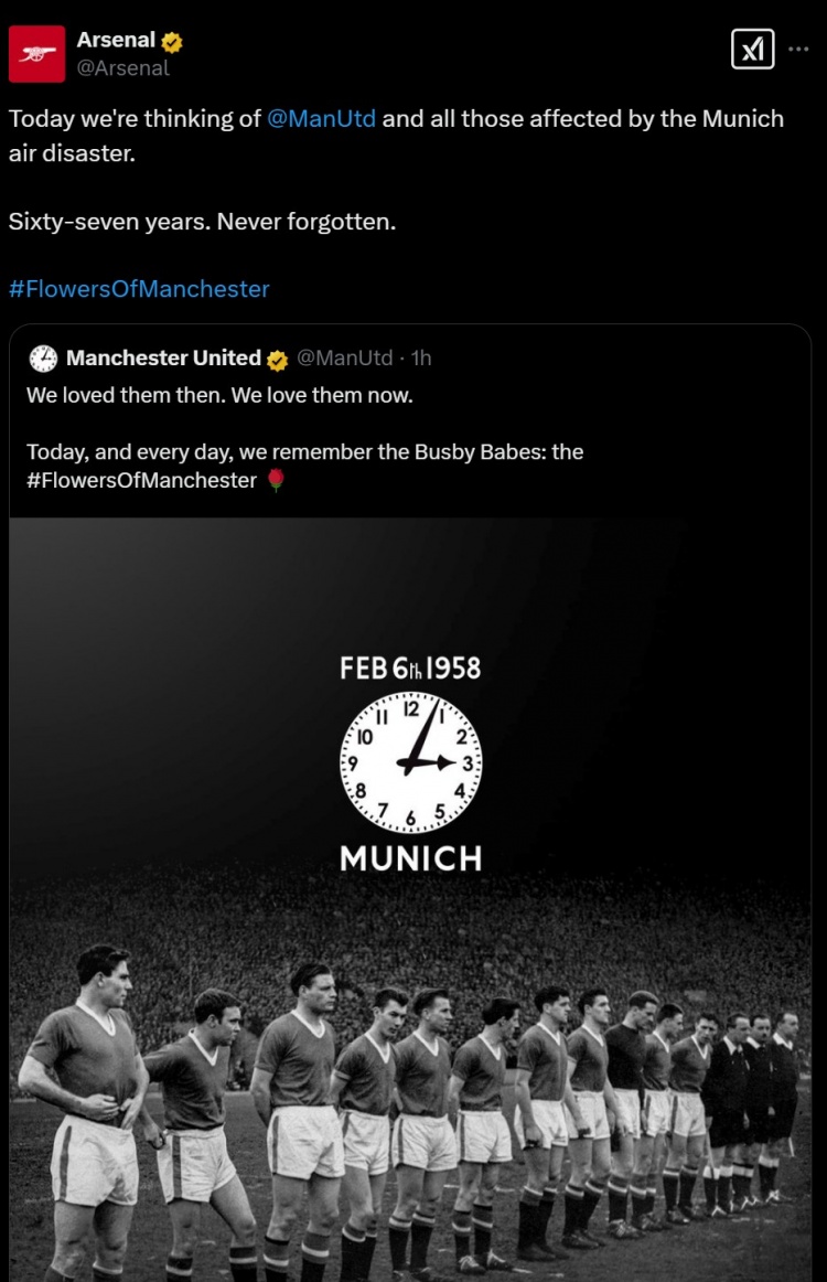 阿森納寫(xiě)道:今天,我們向曼聯(lián)和所有受到慕尼黑空難影響的人們致以哀思。六十七年過(guò)去了,我們永遠(yuǎn)不會(huì)忘記。