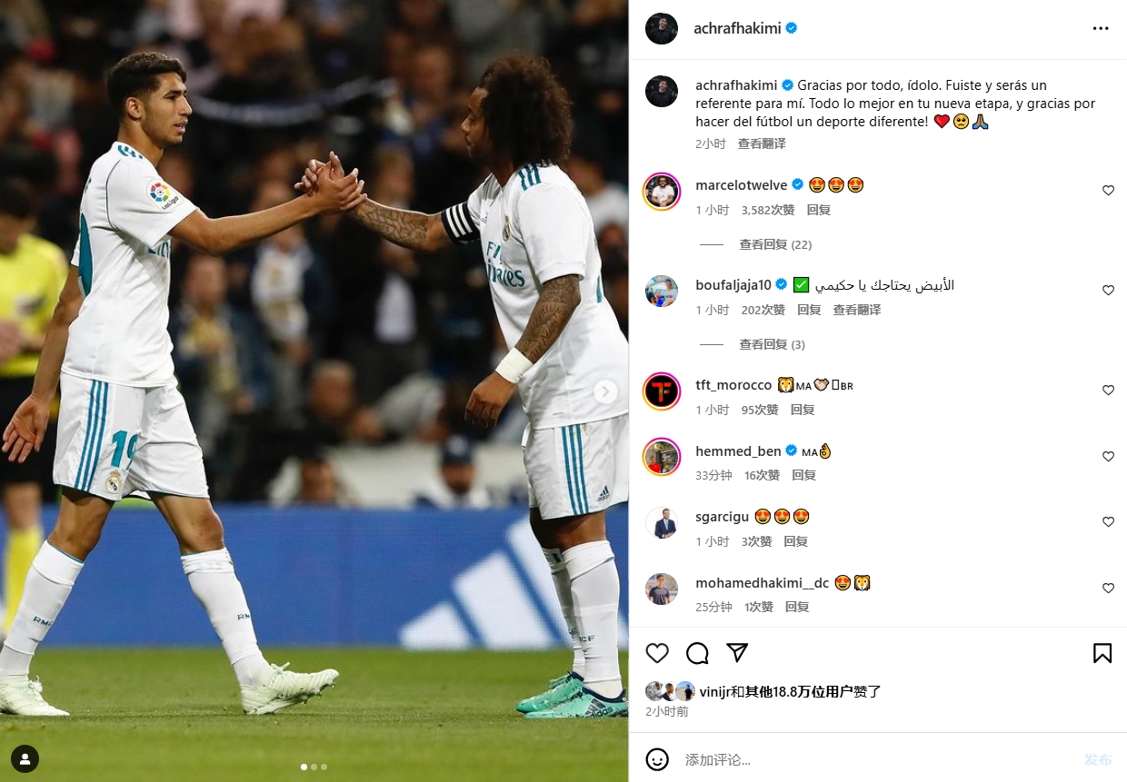 2月7日訊 皇馬傳奇左后衛(wèi)馬塞洛已經(jīng)官宣退役,曾在皇馬和他共事過的右后衛(wèi)阿什拉夫通過社媒送上祝福。阿什拉夫曬出自己和馬塞洛的同框照,并表示:“謝謝你所做的一切,偶像。你曾經(jīng)是、將來也仍然是我的榜樣。祝你在新的舞臺(tái)一切順利,感謝你讓足球變得截然不同。” 本文標(biāo)簽: 足球 法甲 巴黎圣日耳曼 西甲 皇家馬德里