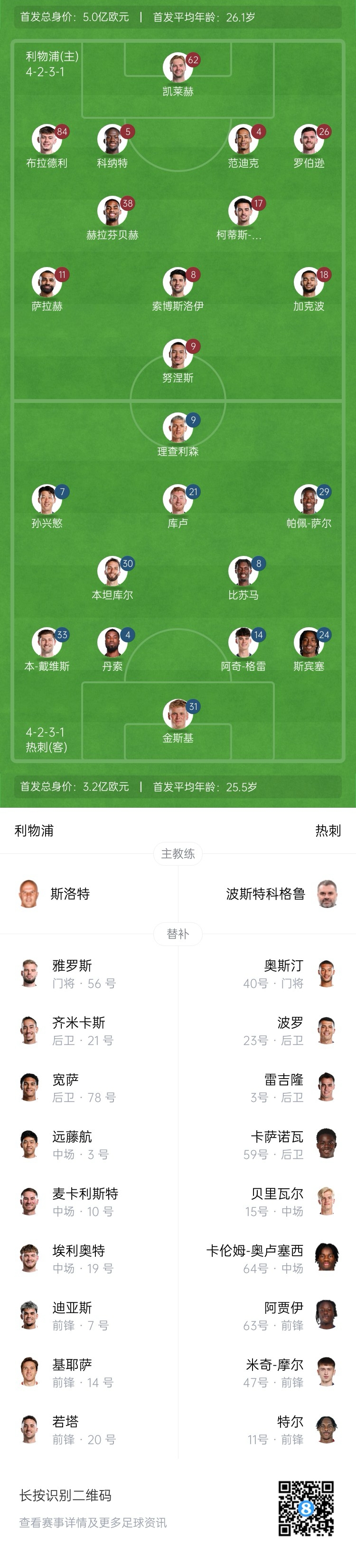 利物浦替補(bǔ):56-雅羅斯、3-遠(yuǎn)藤航、7-路易斯-迪亞斯、10-麥卡利斯特、14-基耶薩、19-埃利奧特、20-若塔、21-齊米卡斯、78-寬薩