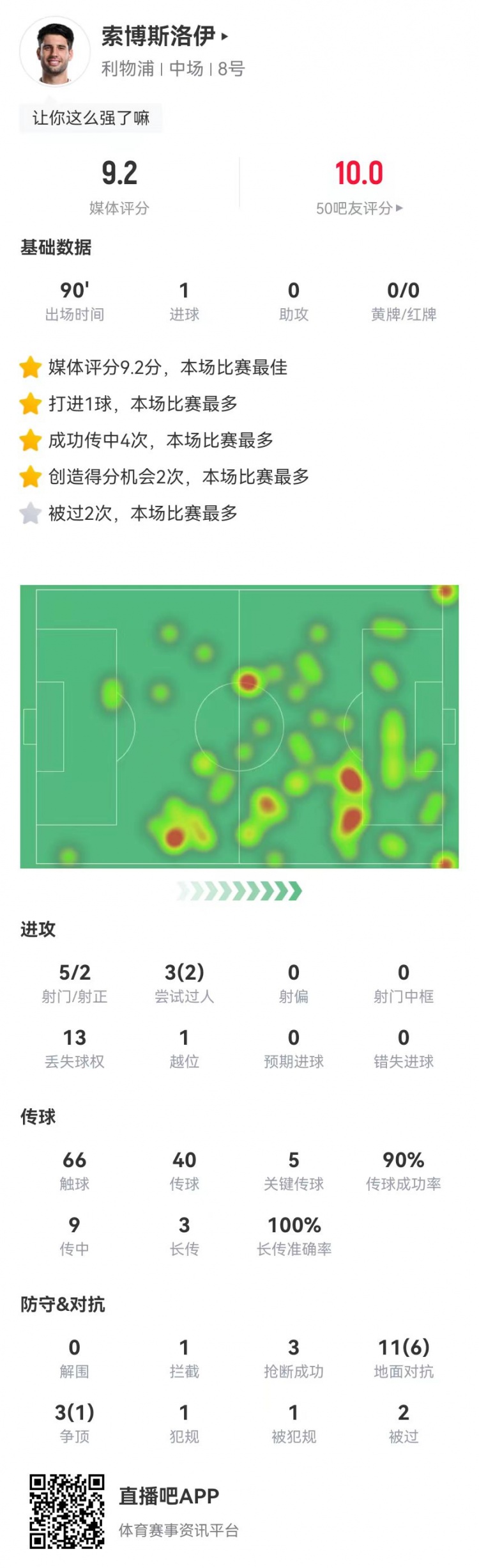2月7日訊 利物浦在本輪聯(lián)賽杯4-0擊敗熱刺,索博斯洛伊本場數(shù)據(jù)如下:首發(fā)踢滿全場1球66觸球40傳球、36成功,成功率90%5關鍵傳球9傳中、4成功3長傳、3成功2創(chuàng)造重大機會5射門、2射正3過人、2成功14對抗、7成功13丟失球權1犯規(guī)1造犯規(guī)1越位1攔截3搶斷2被過獲評9.2分全場最高 本文標簽: 足球 英超 利物浦 熱刺