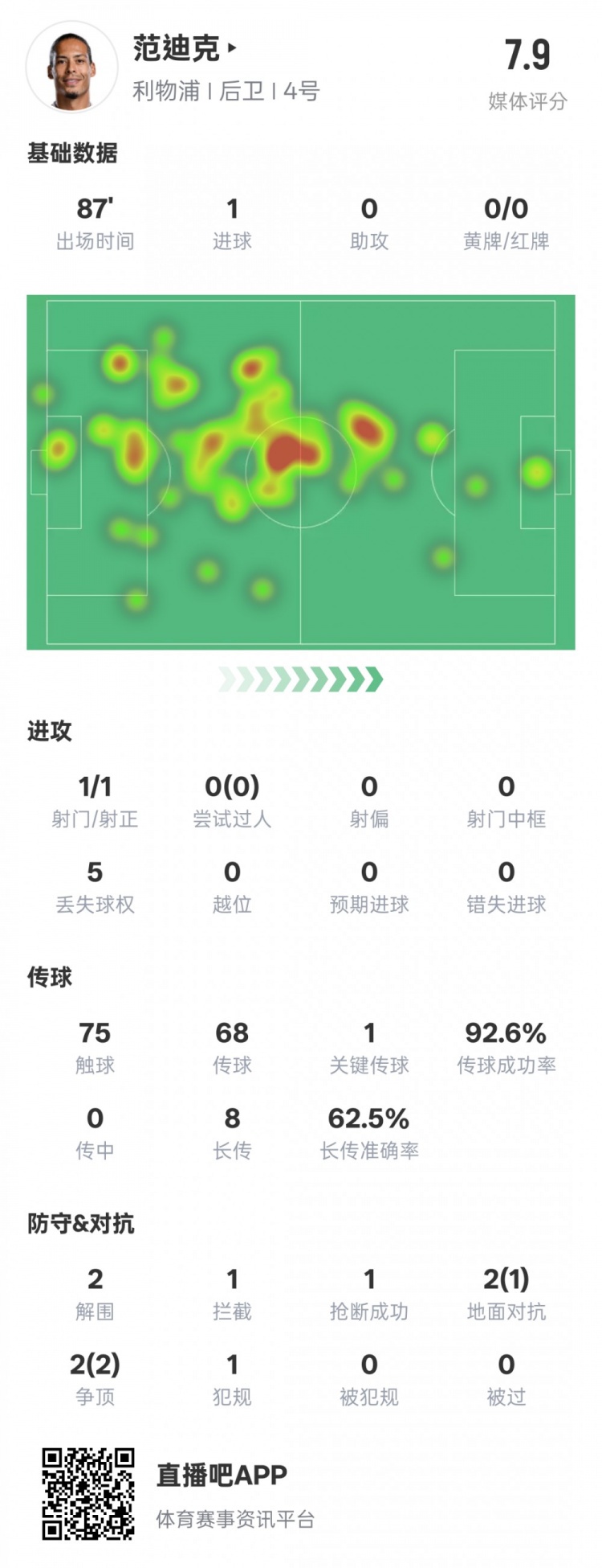 范迪克本場比賽數(shù)據(jù)如下: