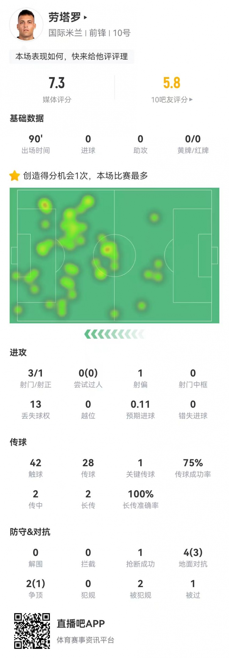 2月7日訊 國米在本輪意甲補(bǔ)賽0-3不敵佛羅倫薩,勞塔羅本場數(shù)據(jù)如下:首發(fā)踢滿全場3射門、1射正42觸球28傳球、21成功,成功率75%1關(guān)鍵傳球2傳中、0成功2長傳、2成功1創(chuàng)造重大機(jī)會6對抗、4成功13丟失球權(quán)2造犯規(guī)1搶斷獲評7.3分 本文標(biāo)簽: 足球 意甲 國際米蘭 佛羅倫薩