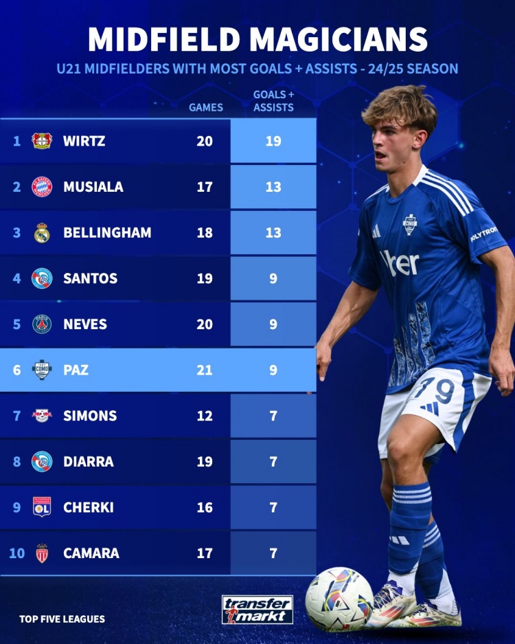 2月7日訊 德國(guó)轉(zhuǎn)會(huì)市場(chǎng)統(tǒng)計(jì)了本賽季五大聯(lián)賽U21中場(chǎng)參與進(jìn)球的數(shù)量,并列出榜單,維爾茨參與19球居首,尼科-帕斯參與9球排名并列第4位。