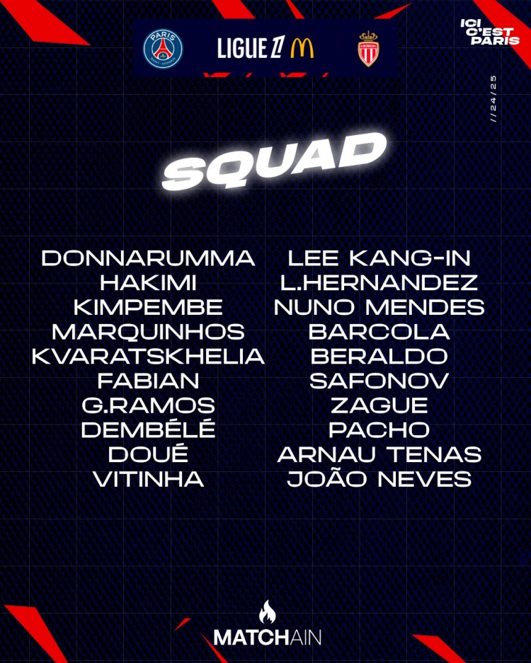 巴黎對陣摩納哥大名單: