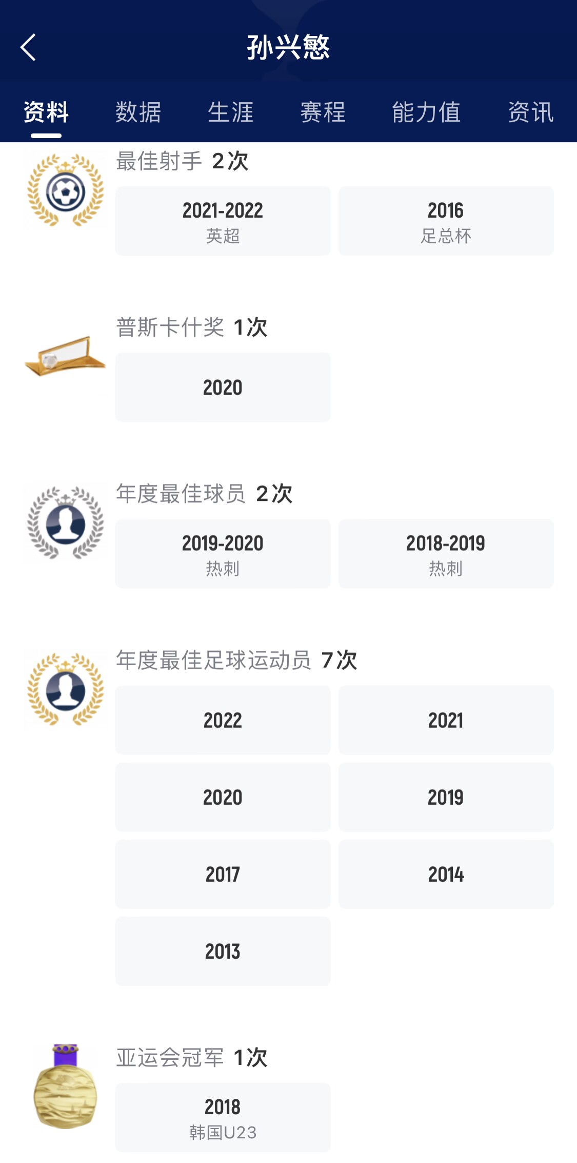 孫興慜2010年代表漢堡首次出戰(zhàn)職業(yè)聯(lián)賽,2013加盟勒沃庫森,2015年加盟熱刺,俱樂部層面尚未贏得任何冠軍榮譽(yù)。