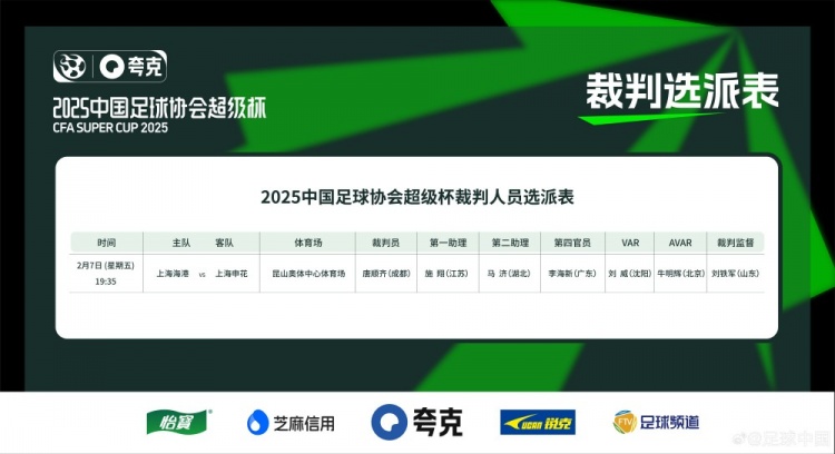 2月7日訊 今晚19:35,2025中國超級杯將在昆山奧體中心打響,由上海海港對陣上海申花。官方消息顯示,本場比賽將由唐順齊主哨。超級杯裁判員名單主裁判:唐順齊第一助理裁判:施翔第二助理裁判:馬濟第四官員:李海新VAR:劉威AVAR:牛明輝裁判監(jiān)督:劉鐵軍 本文標簽: 足球 中超 中國足球 上海海港 上海申花