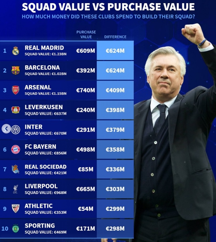 2月8日訊 《轉(zhuǎn)會市場》統(tǒng)計了當(dāng)前陣容身價高于引進費用情況,皇馬巴薩并列居首。