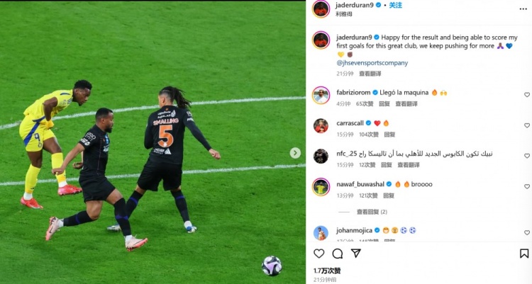 2月8日訊 利雅得勝利在本輪沙特超3-0輕取費(fèi)哈,新援杜蘭首秀雙響建功并獲評(píng)官方本場(chǎng)最佳。他也在賽后通過(guò)社媒曬出自己的比賽照,并配文:“對(duì)勝利感到高興,也很開(kāi)心能夠?yàn)檫@家的偉大俱樂(lè)部打進(jìn)我的處子球,我們會(huì)繼續(xù)努力爭(zhēng)取贏得更多?!?/p> 本文標(biāo)簽: 足球 利雅得勝利 五洲