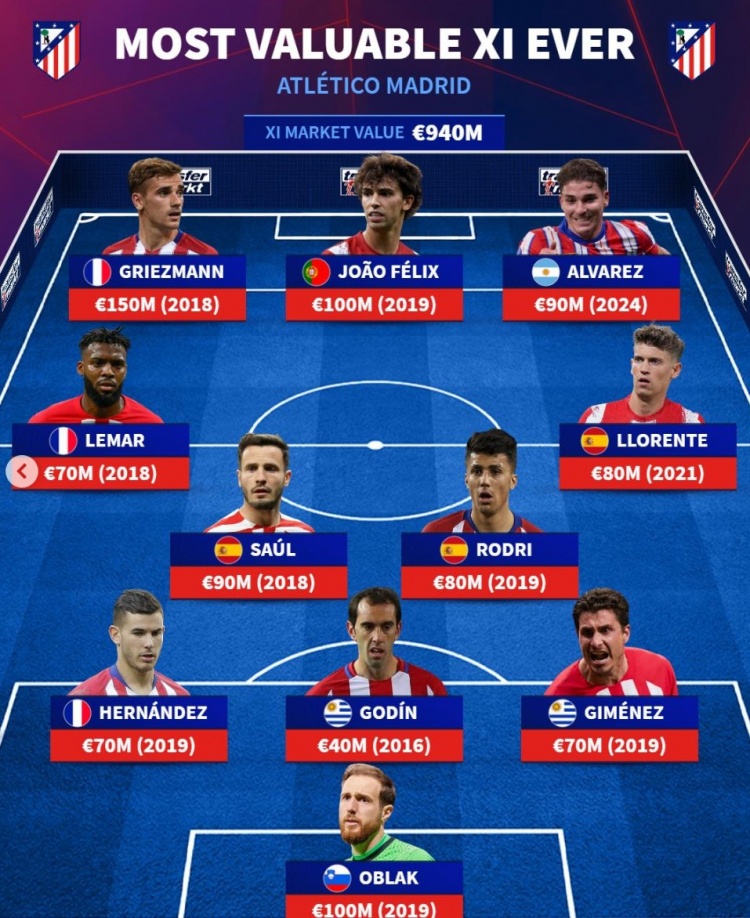 前鋒:格列茲曼(2018,1.5億)、菲利克斯(2019,1億)、阿爾瓦雷斯(2024,9000萬)