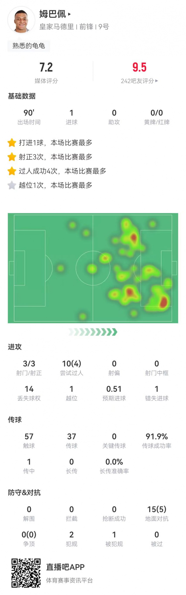 2月9日訊 皇馬在本輪西甲焦點戰(zhàn)1-1戰(zhàn)平馬競,姆巴佩本場數(shù)據(jù)如下:首發(fā)踢滿全場1球預(yù)期進球0.513射門、3射正10過人、4成功1錯失重大機會57觸球37傳球、34成功,成功率92%1傳中、0成功15對抗、5成功14丟失球權(quán)2犯規(guī)1造犯規(guī)1越位獲評7.2分 本文標簽: 足球 西甲 皇家馬德里 馬德里競技